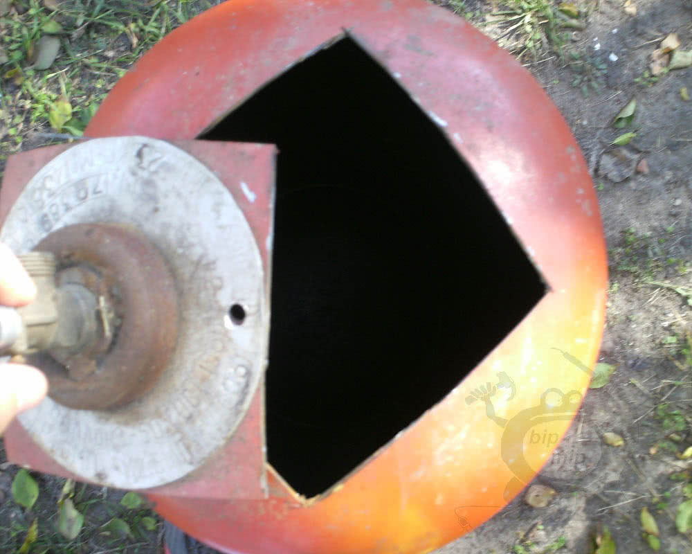 Самодельные печи буржуйки довольно часто делают из старых газовых баллонов. И если вы решили делать буржуйку из газового баллона, то для начала вам необходимо убедиться в том, что там нет остатков газа! Выкрутите вентиль на полную, и переверните баллон, делайте это на улице, соблюдая все правила противопожарной безопасности, так как газ ядовит и взрывоопасен. У меня в баллоне был газ, и ждать долго пока он весь вытечет я не мог (уже холодало)