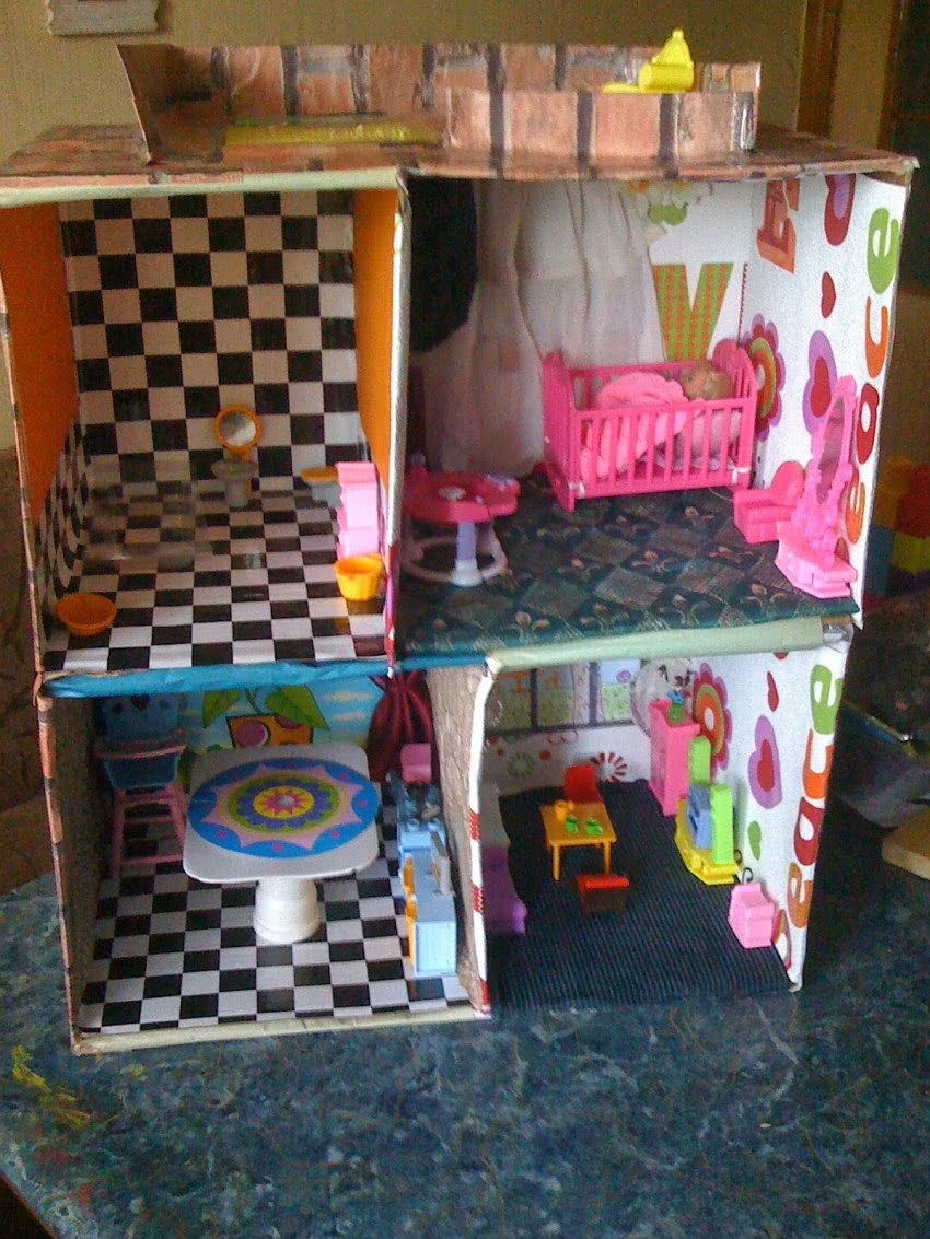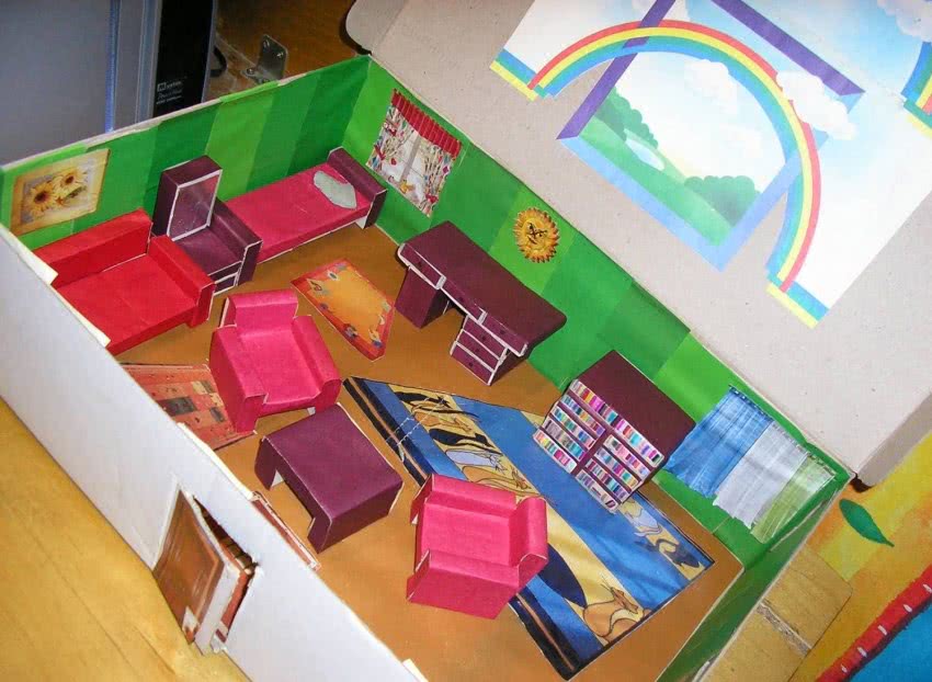 Достаточно лишь аккуратно обклеить будущий домик красивой бумагой, вырезать окошки и дверцу. С внутренней стороны приклеить на окна занавески и вуа-ля! Домик готов! Теперь ребенок становится счастливым обладателем уникальной поделки.