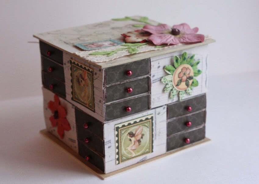 Таким же образом можно сделать оригинальную шкатулку-комодик для бижутерии, мелких предметов: булавок, пуговиц. Сделать поделку из спичечных коробок просто: нужно сложить вместе желаемое количество коробочек, склеить их между собой и сделать общий корпус, декорировать по своему желанию: