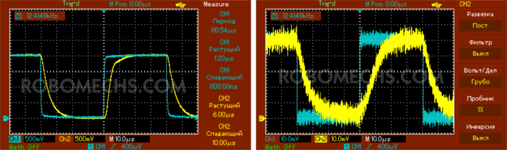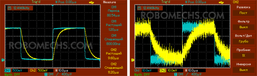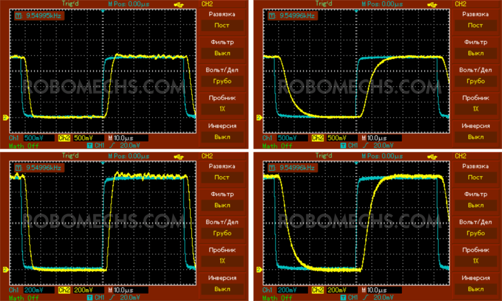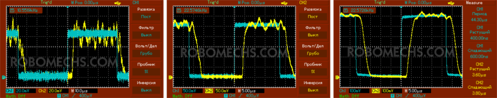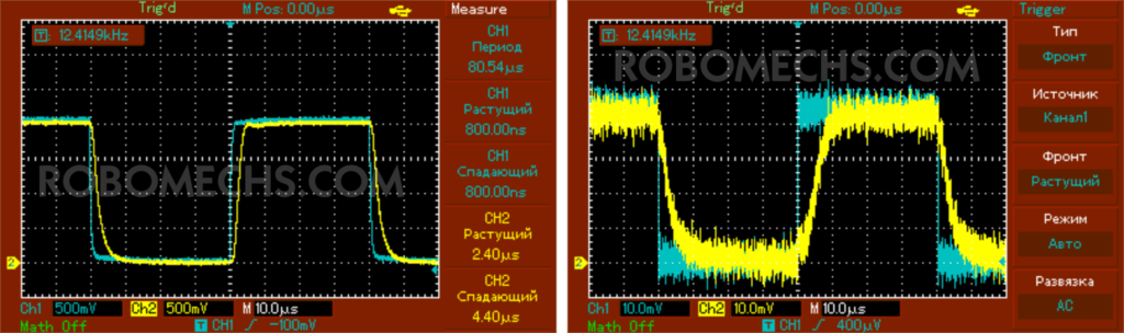 Разница только в номиналах для il300, hcnr201 R1,R3=30k, R2=100R, а для loc110 10k и 200R соответственно (я подбирал разные номиналы чтобы добиться максимального быстродействия, но при этом не выйти за допустимые пределы, например, по току излучающего диода). Ниже приведены осциллограммы, которые говорят сами за себя (здесь и далее: синий – входной сигнал, желтый — выходной).