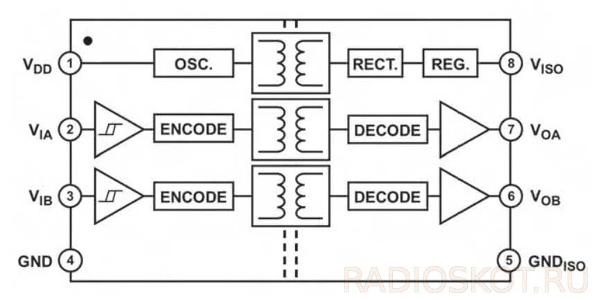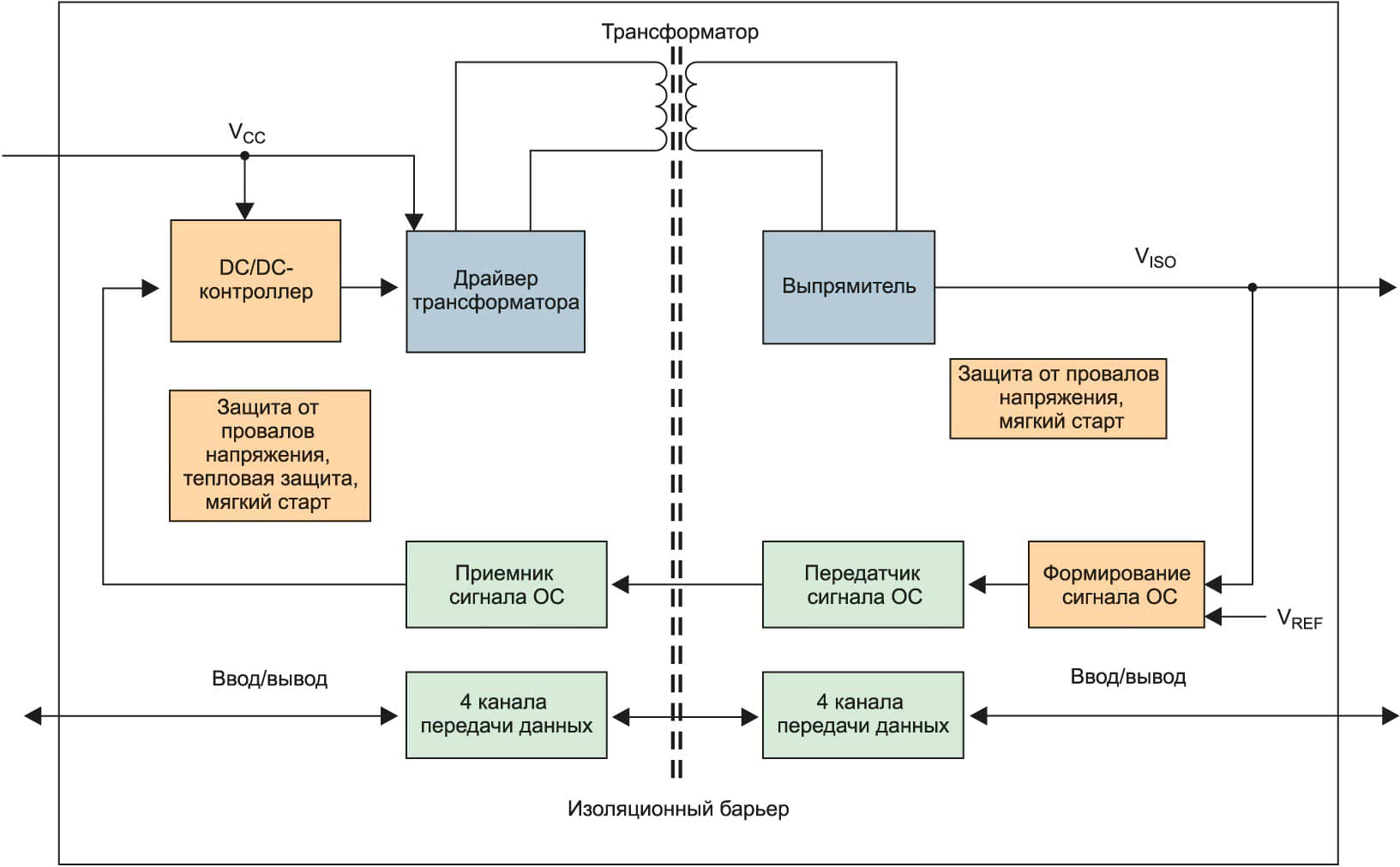 В качестве примера рассмотрим гальваническую развязку ISOW784x компании Texas Instruments. Ее структурная схема показана на рис. 5.