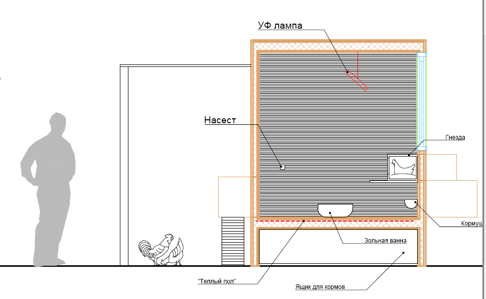 Таким образом, комфортнее всего для них будет расположение кормушек и там и там. Для того, чтобы точно ничего не перепутать, следует делать точные чертежи курятника для кур своими руками.