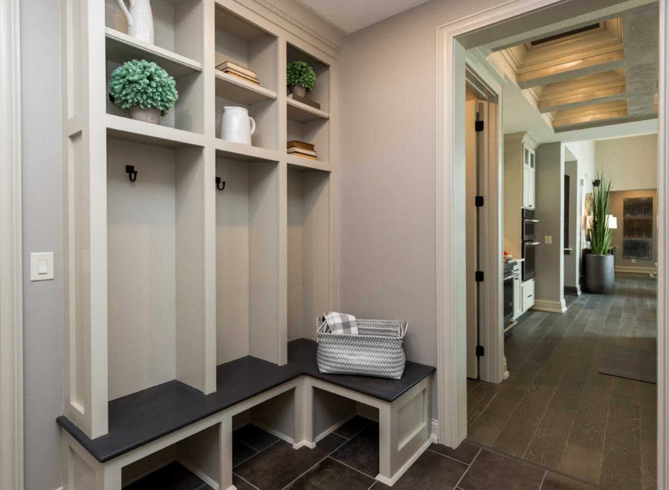 Первая комната, встречающая гостей и уставших владельцев, должна отличаться удобством размещения мебели и практичностью отделки. Здесь необходимо предусмотреть место для размещения верхней одежды и обуви, пуфик и диванчик для переобувания, полочку для ключей, сумок или зонтов.