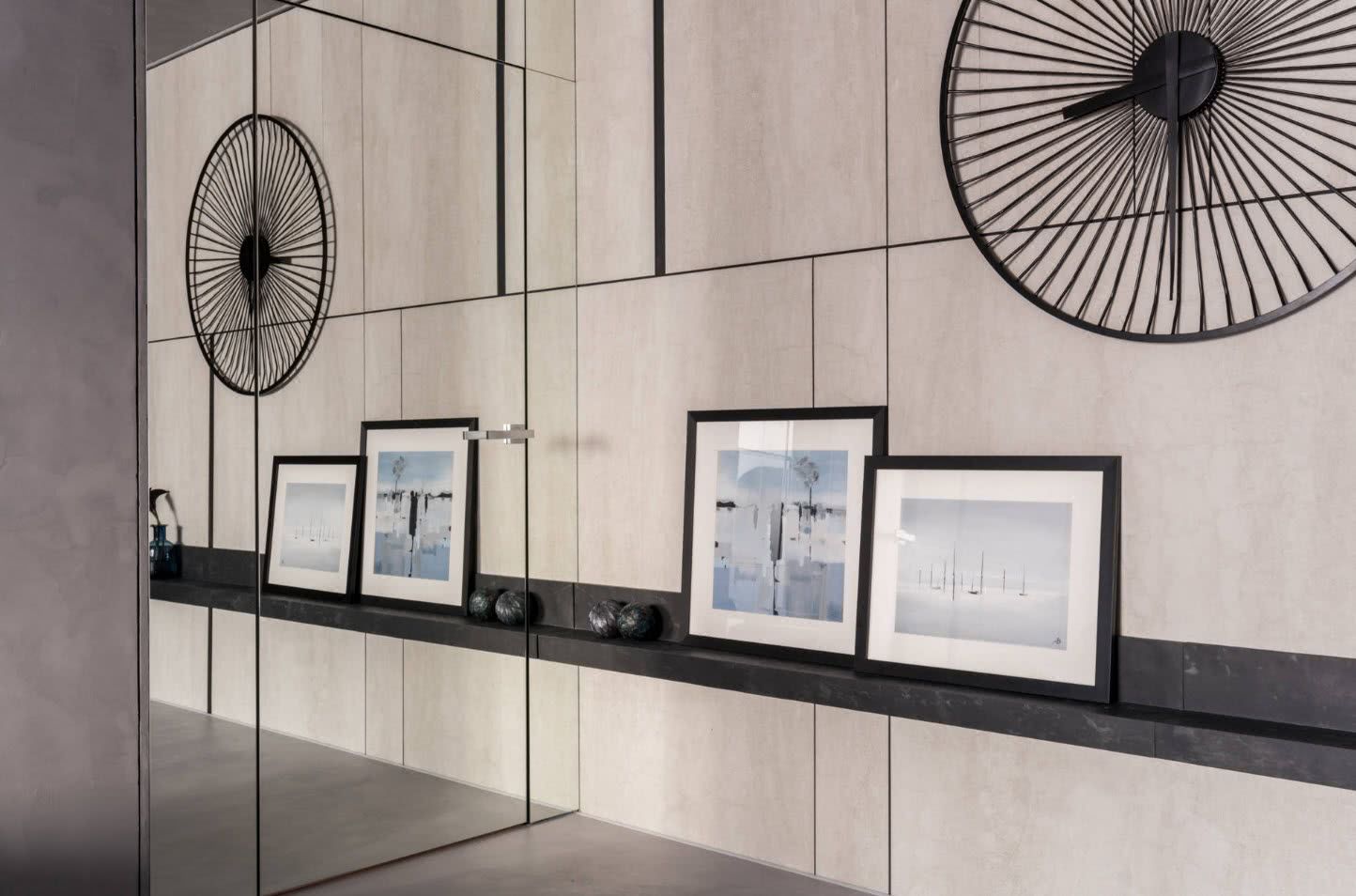 На фото панорамное зеркало, состоящее из квадратов в интерьере современной прихожей.