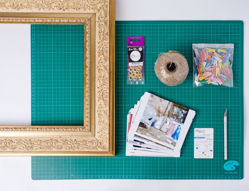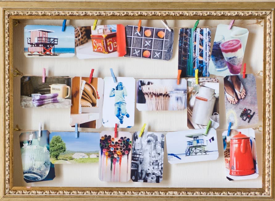 Размещаем фотографии по композиции, которую сняли на телефон. Фиксируем их с помощью маленьких прищепок.