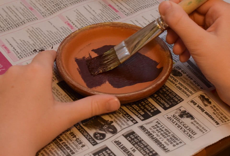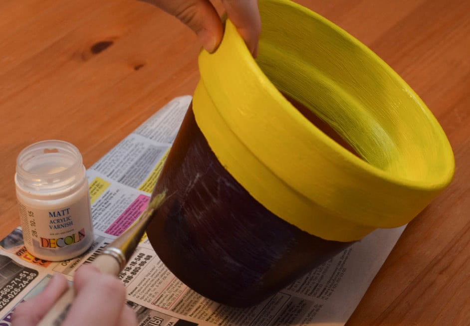 На стол кладем газету, чтобы не испортить его материалами. Окрашиваем верхнюю часть горшка краской желтого цвета.