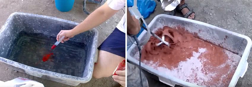Набрав необходимое количество воды комнатной температуры, в неё добавляют сухую смесь. Постоянно подсыпая в ведро сухой раствор, его размешивают при помощи дрели с насадкой миксер. Потом получившаяся смесь отстаивается 10-15 минут и снова перемешивается.