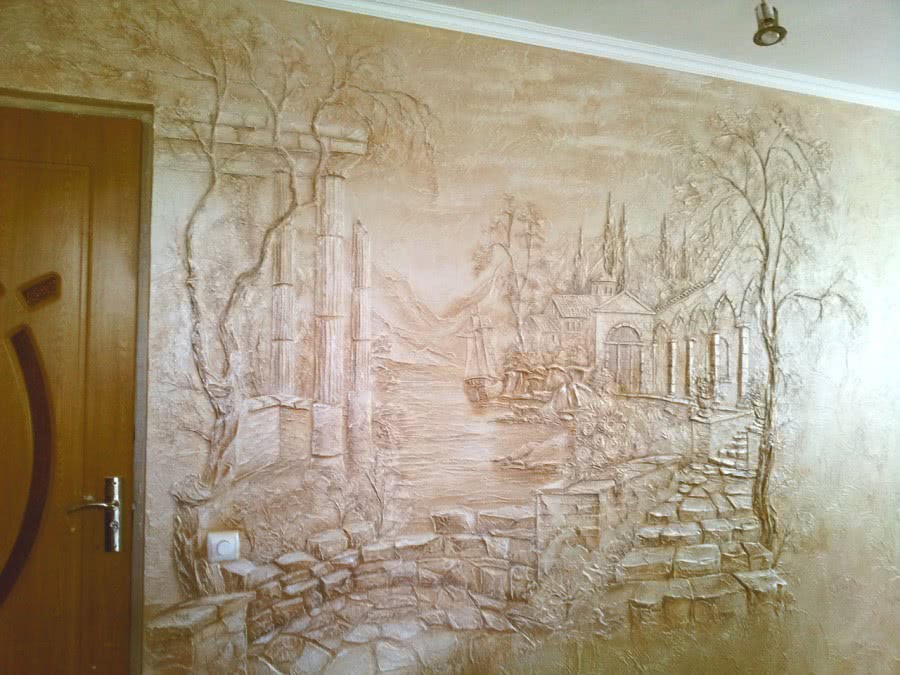 Отделка фактурной штукатуркой – это безграничные возможности для фантазий. С их помощью делают панно, вырезают узоры и создают целые картины.