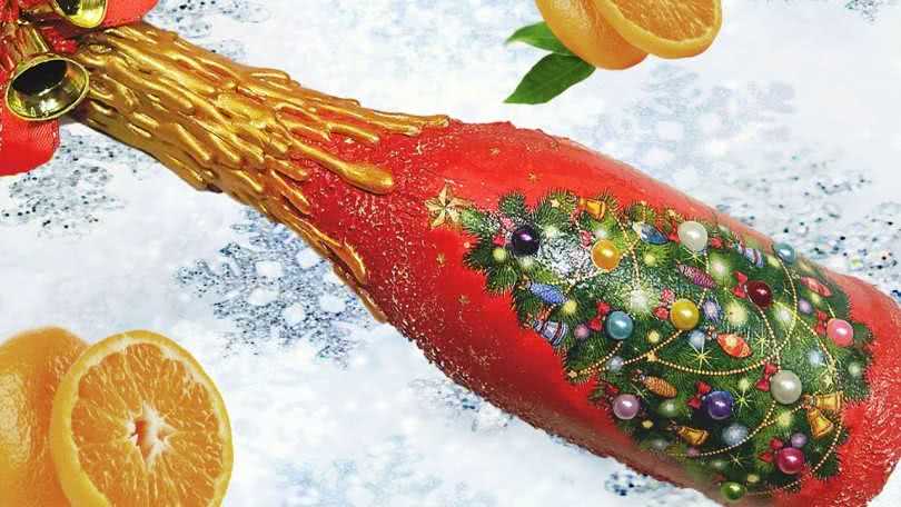 Оригинально будут смотреться бутылки шампанского в новогоднем декоре, с цветочными узорами или тематическим оформлением