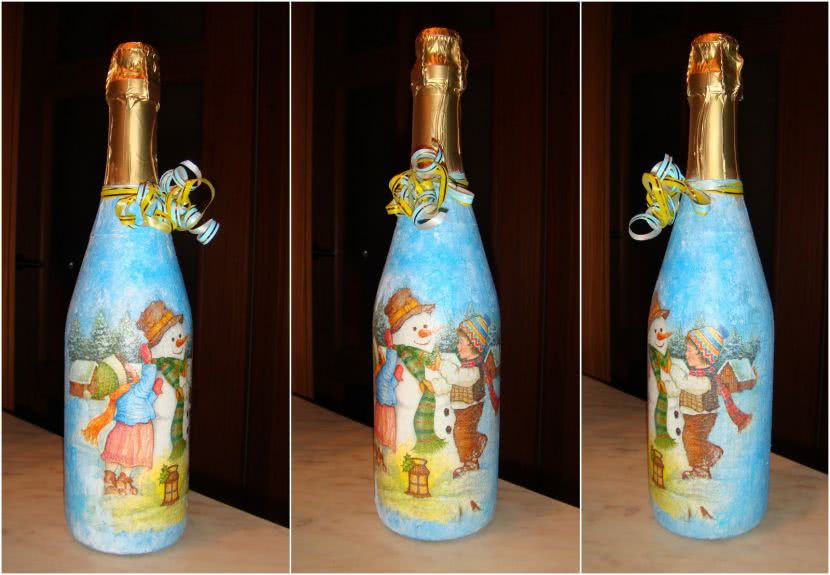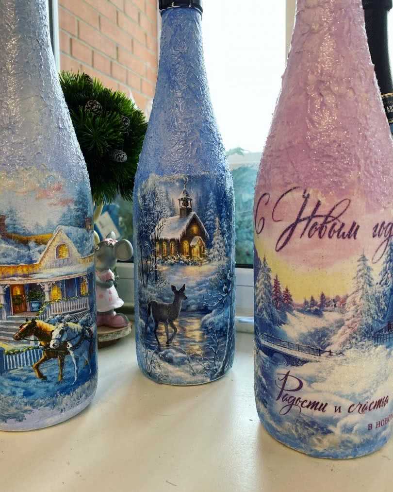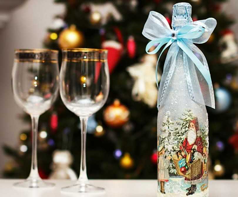 Декупаж бутылок на новый год или другие события выполнить можно несколькими способами. Некоторые предпочитают работать с увлажненным рисунком. После переноса картинки на обработанное стекло, оно выглядит более естественно и не требует специфического дополнительного оформления.