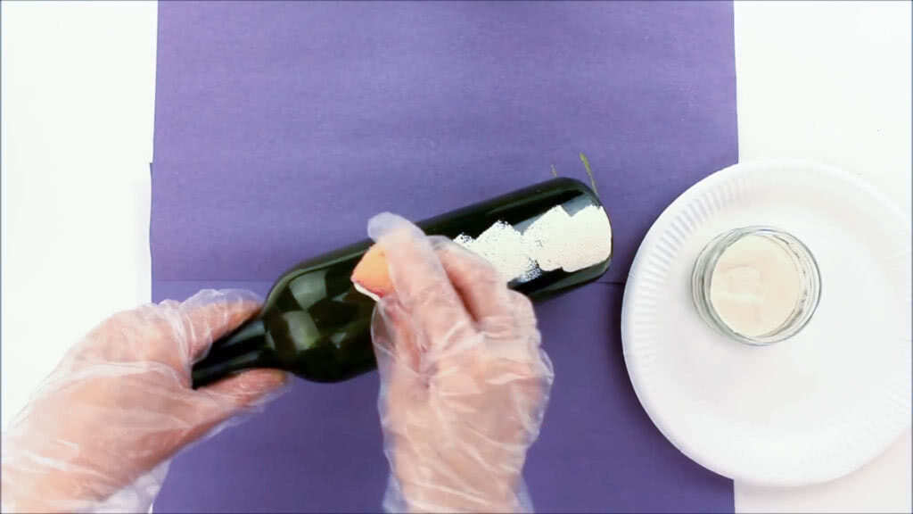 Цвет краски необходимо выбирать на тон светлее или темнее рисунка, чтобы он не сливался с фоном и декупаж на бутылках из салфеток смотрелся контрастно. Нанесите несколько слоев краски для придания фону рельефа и глубокого цвета.