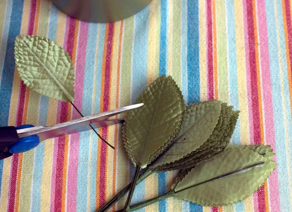 Из декоративной ленты зеленого цвета необходимо нарезать небольшие лоскуты, которыми обматывается готовый ствол. Его можно дополнительно украсить бисером.