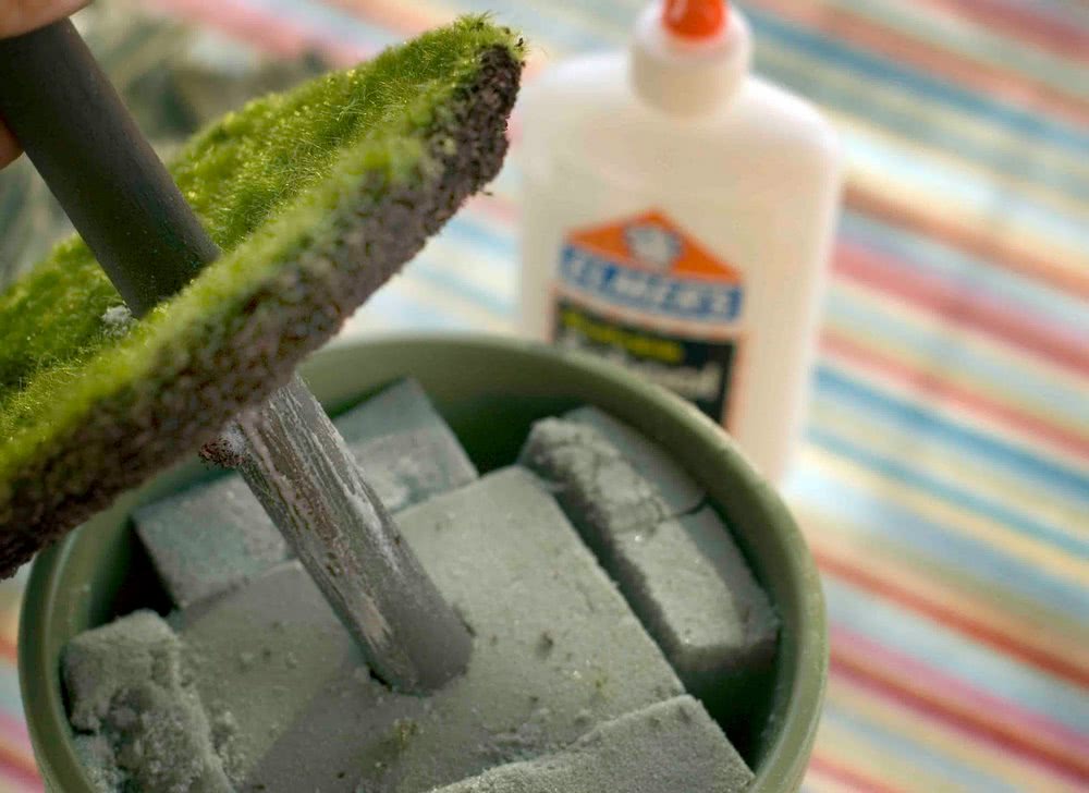- ножом прорежьте паролоновый шар и капните немного клея в отверстие. Вставьте задекорированную палку,