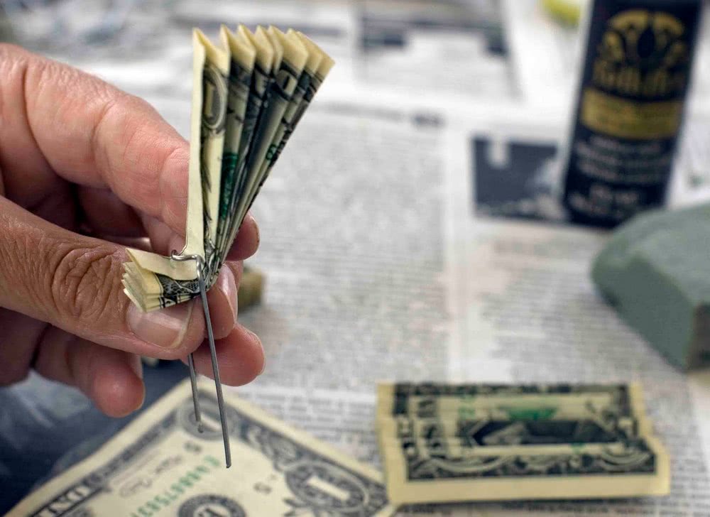 процесс изготовления денежного топиария — прикрепление бумажной купюры к основе булавкой