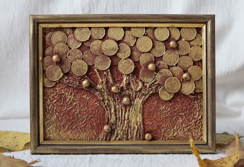 Эффектным получается также денежное дерево, выполненное как панно (объемная картина). В качестве основы используется плотный картон, ДВП, холст или мешковина. Монетки, ствол из проволоки или толстых вязальных нитей, корни и другие элементы панно крепятся клеем моментального действия (или клеевым пистолетом). Ствол дерева можно изготовить даже из небольшого количества шпаклевки, в которой при застывании процарапывается фактура ствола и ветвей дерева. В таком случае, шпаклевка и монетки покрываются краской, лучше золотистого цвета.