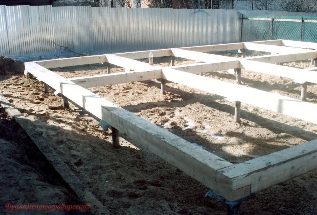 Первый ряд деревянных кирпичей укладывается на подкладной брус — нижнюю обвязку дома, опирающуюся на фундамент. Крепление кладки к опорному брусу производится посредством прижимных брусков, фиксирующихся стержневыми или трассовыми натяжителями через металлические пластины. Одним концом натяжитель монтируется в стену, а вторым, с помощью анкерного болта крепится к фундаменту.