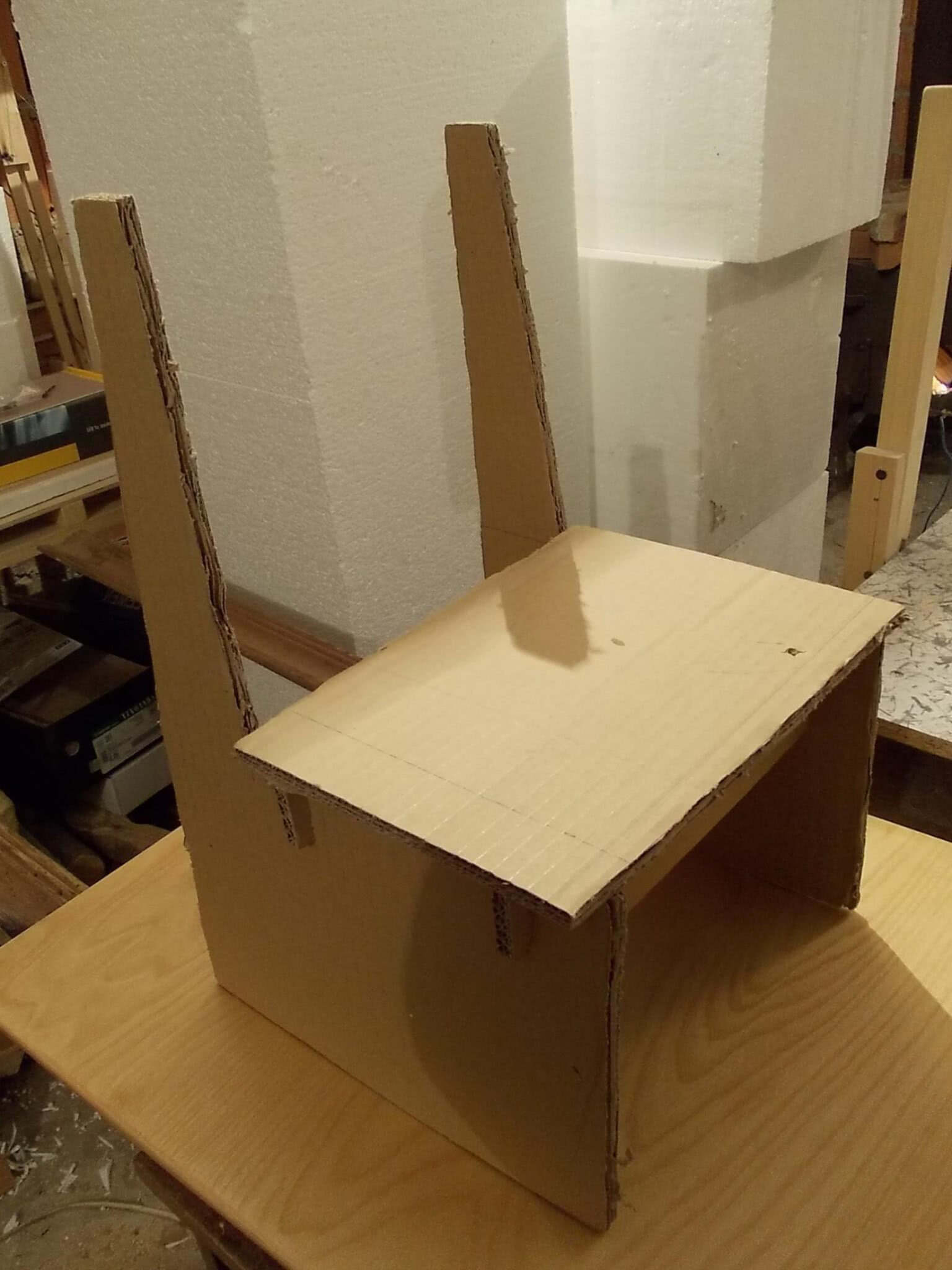 Складывающаяся модель изготавливается несколько сложнее, чем предыдущий вариант, но при этом имеет более изысканный вид и при необходимости может трансформироваться в обычный стул.