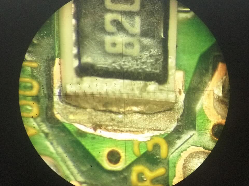 К этому элементу по печатной плате напрямую идет защитный диод, который так же оказался неисправен так как звонился накоротко. Дорожка от диода идет прямо в район мощного полевого транзистора.