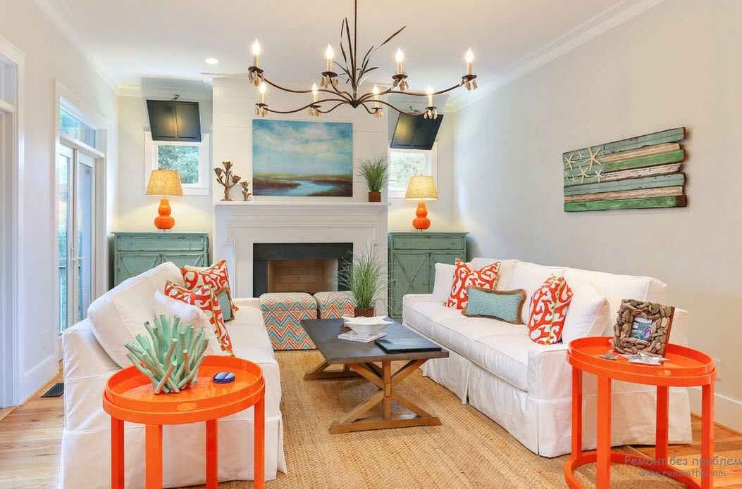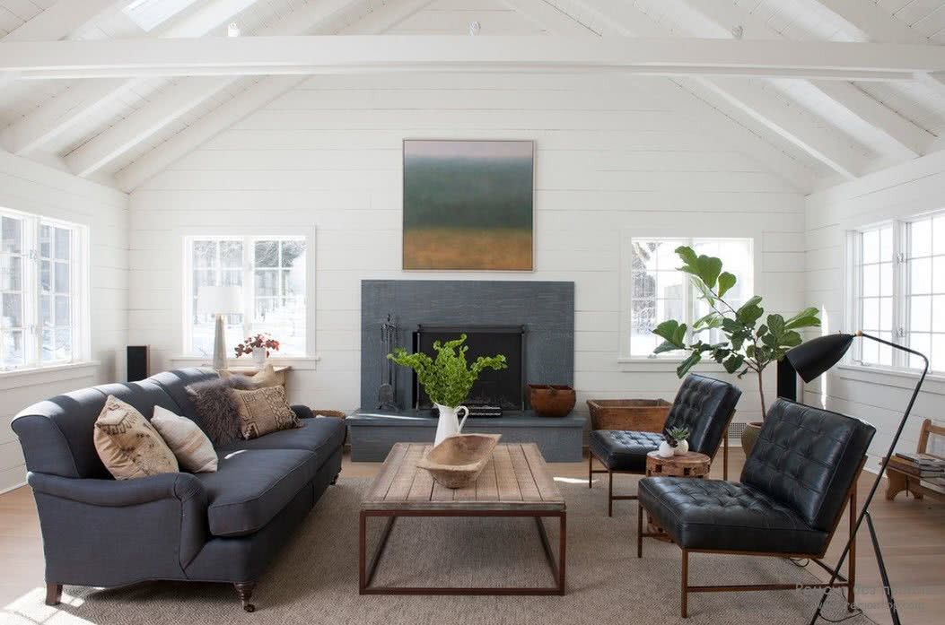 В гостиной в деревенском стиле должна присутствовать простота и натуральные материалы. Древесина может быть ведущим элементом, поэтому стоит разместить деревянные полы, мебель и даже стеновые панели. Кроме того, можно уложить шерстяные одеяла, льняные скатерти и кожаные коврики. Плед или шторы в клетку, а также кружева будут выглядеть хорошо. Замечательная идея — камин, который принесет теплые, дружественные ноты в интерьер.