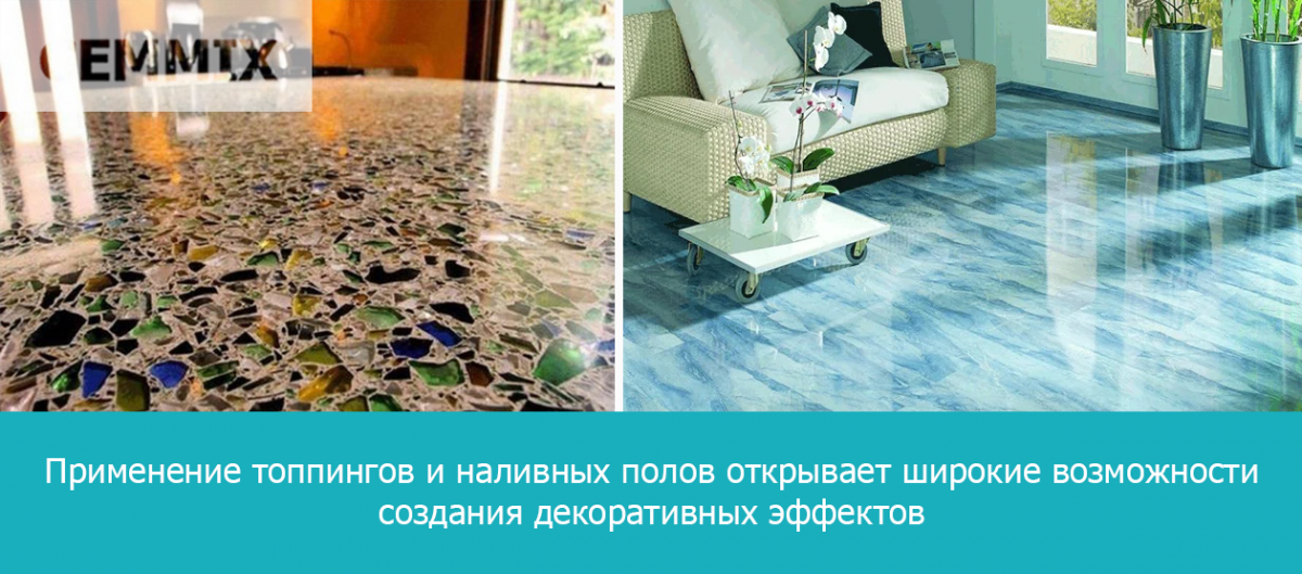 Затирочными машинами пол обрабатывают, пока он не отвердел окончательно. На этом этапе обработки применяется также нанесение топпингов. Топпингами называют специальные смеси на основе портландцемента с различными декоративными добавками (например, пигментами). Их применение открывает широкие возможности создания декоративных эффектов.