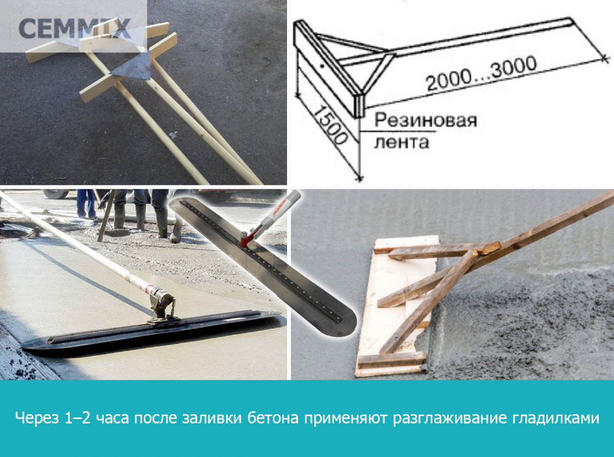Через 1–2 часа после заливки бетона применяют разглаживание гладилками, которое помогает лучше уплотнить и выровнять смесь.