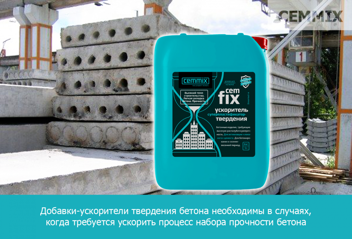 Добавка-ускоритель твердения CemFixявляется комплексной добавкой, которая не только увеличивает раннюю (на 20–40%) и марочную (на 15–20%) прочность бетона, но и повышает удобоукладываемость смеси, экономит цемент в замесе (5–10%), снижает водопотребность раствора, препятствует коррозии арматуры, увеличивает водонепроницаемость бетона.