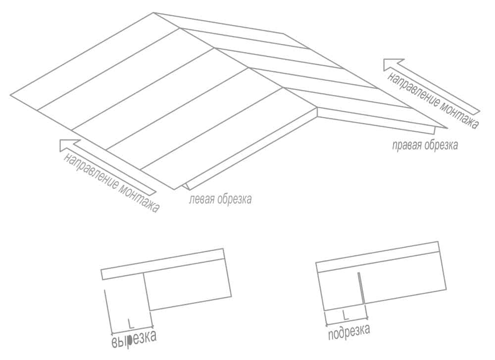 Особенность кровельных элементов в том, что их укладывают не встык, а с нахлестом. На верх стартовой панели наносят силиконовый герметик, на следующей панели подрезают торцевую часть с утеплителем на величину нахлеста. Обычно она составляет 20 или 30 см. При этом действует правило: чем менее покатая крыша, тем больше нахлест. Направление работы — от свеса крыши к ее коньку.
