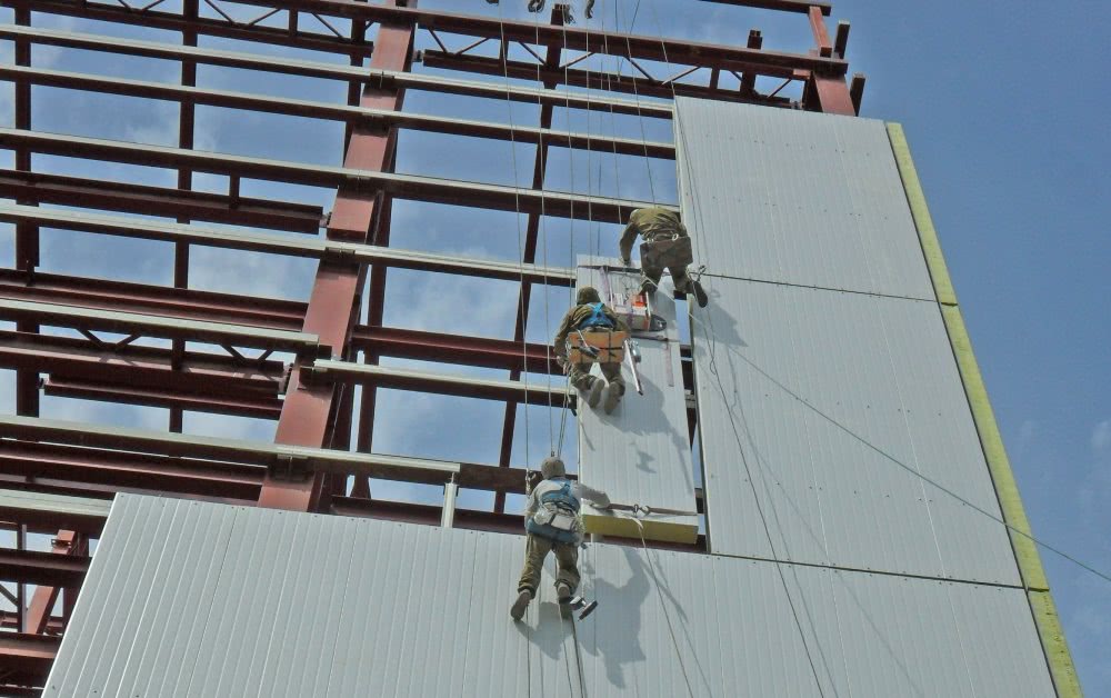 - Монтаж сэндвич-панелей. Установка панелей занимает считанные минуты, большую часть времени занимает герметизация стыков и установка доборных элементов.
