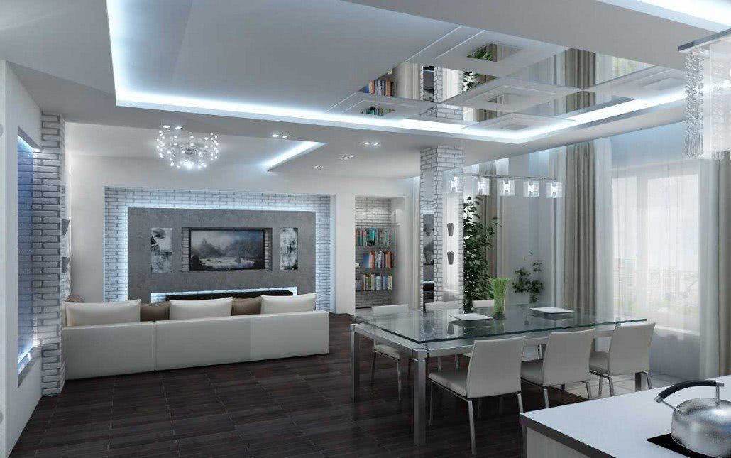 Гостиная хай-тек выполняется в сдержанных тонах, допускается использование ярких деталей, например в мебели или отделке. Потолок, пол и стены имею прямые линии. Одна из стен, например та, на которой висит телевизор, может быть отделана кирпичной кладкой или камнем.