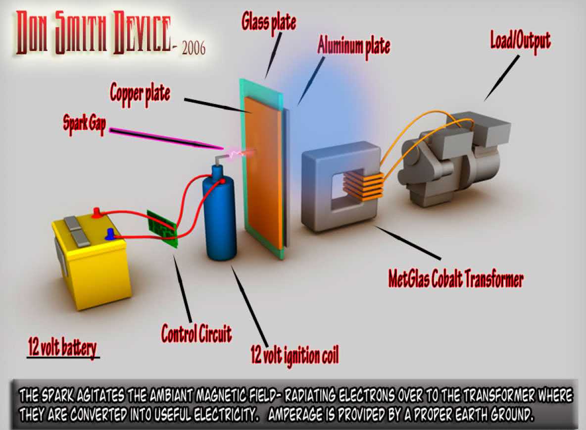 Дональд Смит является самым известным изобретателем бестопливного генератора. Конструкция прибора довольно проста: берётся волновой резонатор и раскачивается с помощью искрового генератора. Помимо этого, в схеме есть диоды, функция которых совершенно не ясна. Но самое главное, откуда в генераторе берётся дополнительная энергия, да ещё и в количестве около 10 КВт?