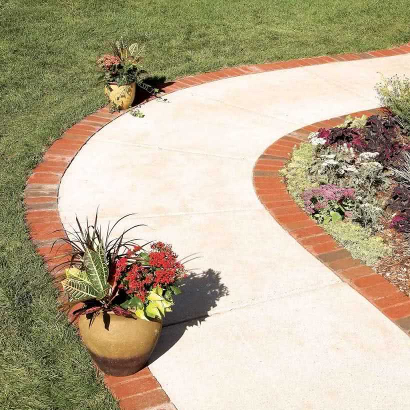 При желании в бетонную смесь добавляется краситель, тогда скучный серый цвет бетона превращается в игру красок на зеленом полотне садового газона .