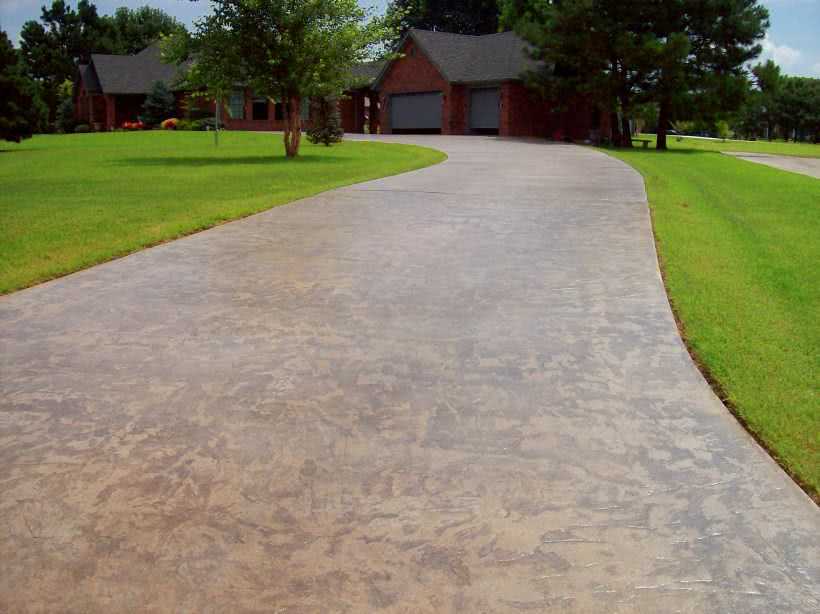 Интересный вариант можно получить, используя трафарет для бетонной дорожки. Он позволяет получить эффект мощения диким камнем или тротуарной плиткой. Но скажем сразу — такой вариант для новичка будет несколько сложным. Технология отличается большей сложностью. Поэтому выбирайте такое решение только тогда, когда уверены в своих силах.
