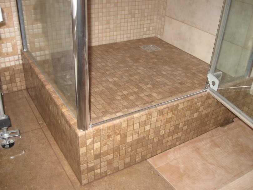 Такой вариант подходит для любого жилья. Его единственный недостаток заключается в том, что во влажном помещении бывает неудобно перешагивать через порог, поднимаясь на постамент. При значительном удалении от канализации придется скрыть коммуникации в гипсокартонный короб или под стяжку.