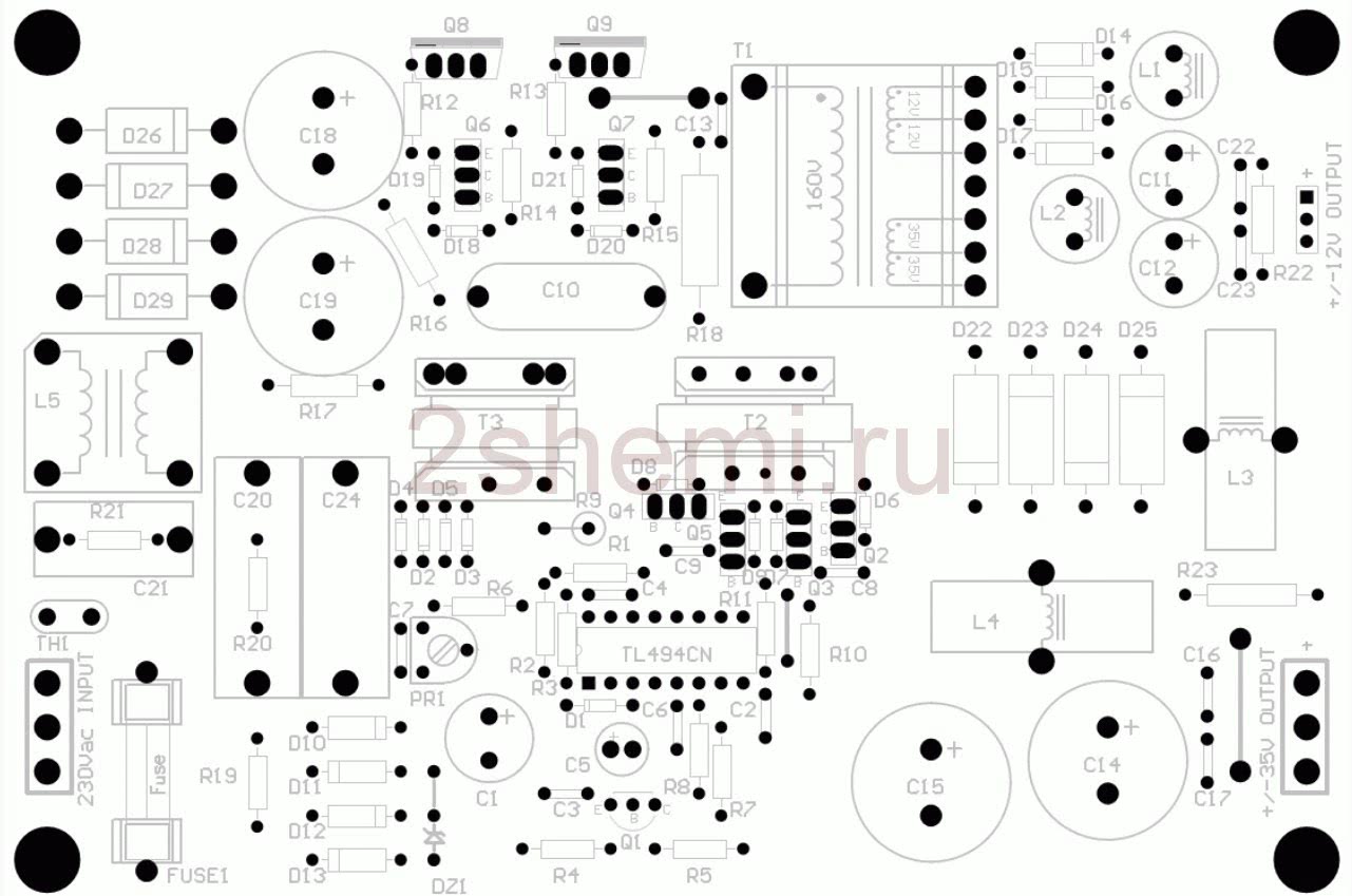 Инвертор состоит из нескольких базовых модулей, присутствующих в большинстве похожих БП, таких как блок питания ATX. Предохранитель, термистор и сетевой фильтр, состоящий из C21, R21 и L5, идут к источнику питания переменного тока 220 В. Затем выпрямительный мост D26-D29, входные конденсаторы инвертора C18 и C19 и силовые транзисторы Q8 и Q9 для переключения напряжения на трансформаторе. Силовые транзисторы управляются с помощью дополнительного трансформатора T2 одним из самых популярных ШИМ-контроллеров — TL494 (KA7500). Трансформатор тока Т3 для измерения выходной мощности последовательно соединен с первичной обмоткой. Трансформатор T1 имеет две разделенные вторичные обмотки. Одна из них формирует напряжение 2×35 В, а другая 2×12 В. На каждой из обмоток есть фаст диоды D14-D17 и D22-D25, которые в общей сложности образуют 2 выпрямительных моста.