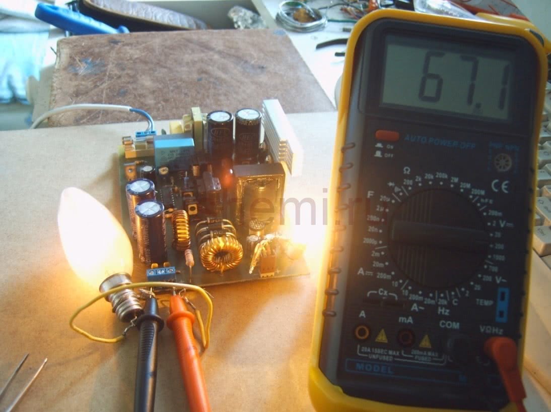 Если тест пройдет успешно и получим на выходе +/- 2 В, можно отключить источник питания лампы и припаять индуктивность L5. С этого момента инвертор должен работать от сети 220 В через лампу на 60 Вт. После подключения к сети лампочка должна кратковременно мигнуть и немедленно полностью отключиться. На выходе должно появиться +/- 35 и +/- 12 В (или другое напряжение в зависимости от соотношения оборотов трансформатора).