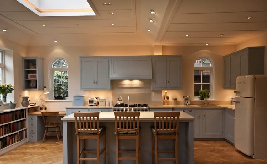 - Освещение. Для монтажа светильников необходим зазор между основным потолком и подвесным, равный ножке светильника. Это тоже приведет к «опусканию» высоты. К моменту установки потолочной конструкции все точки питания должны быть предусмотрены, так же как и места установки светильников и спотов.