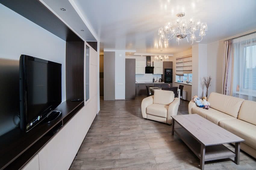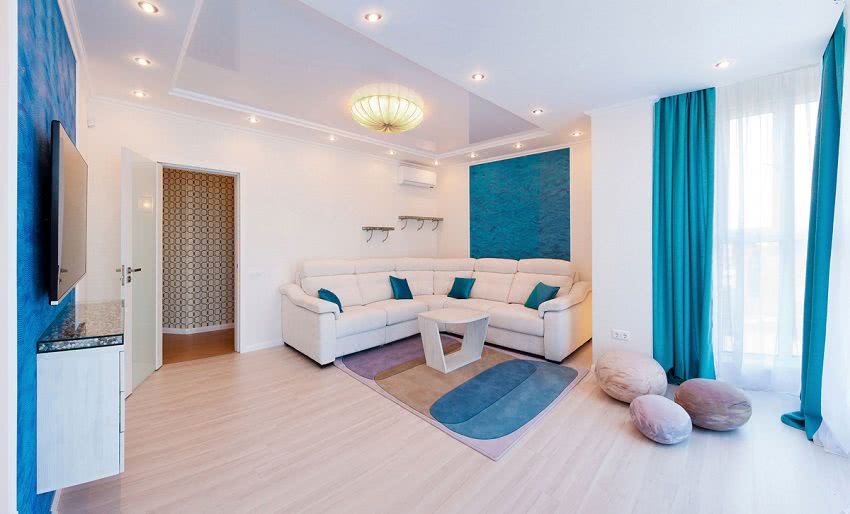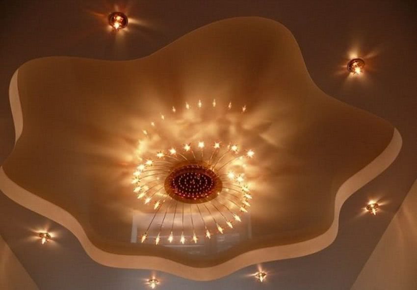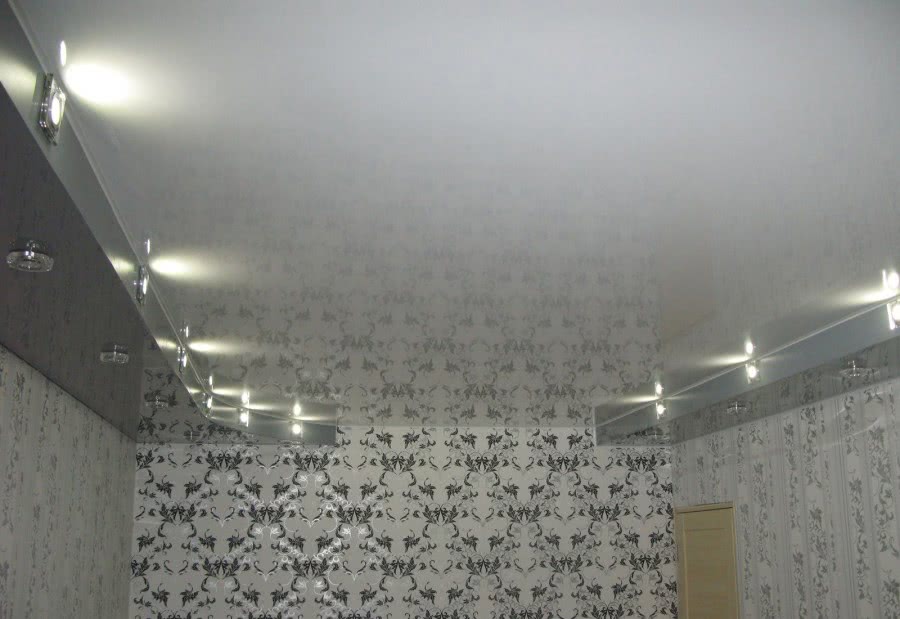 Потолок в квартире может быть достаточно простым – прямоугольное белое полотно со вторым ярусом в виде рамки, но если его дополнить оригинальной люстрой, это сразу меняет впечатление. В этом случае осветительный прибор становится акцентом, а дополняют его мелкие светильники по периметру рамки. Также используется глянцевая поверхность, которая отражает свет и визуально делает комнату более просторной, что может пригодиться для небольших помещений.