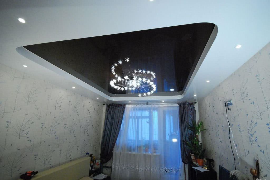 Потолок в квартире может быть достаточно простым – прямоугольное белое полотно со вторым ярусом в виде рамки, но если его дополнить оригинальной люстрой, это сразу меняет впечатление. В этом случае осветительный прибор становится акцентом, а дополняют его мелкие светильники по периметру рамки. Также используется глянцевая поверхность, которая отражает свет и визуально делает комнату более просторной, что может пригодиться для небольших помещений.