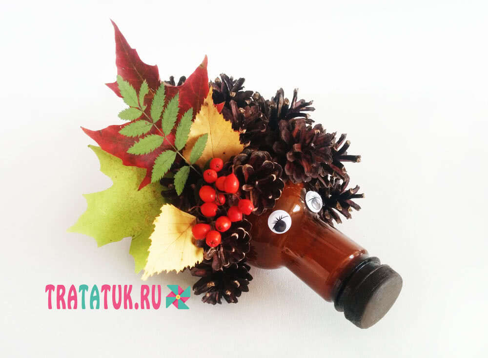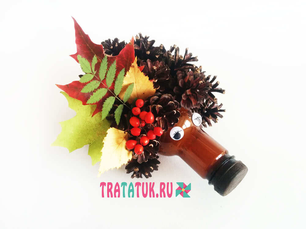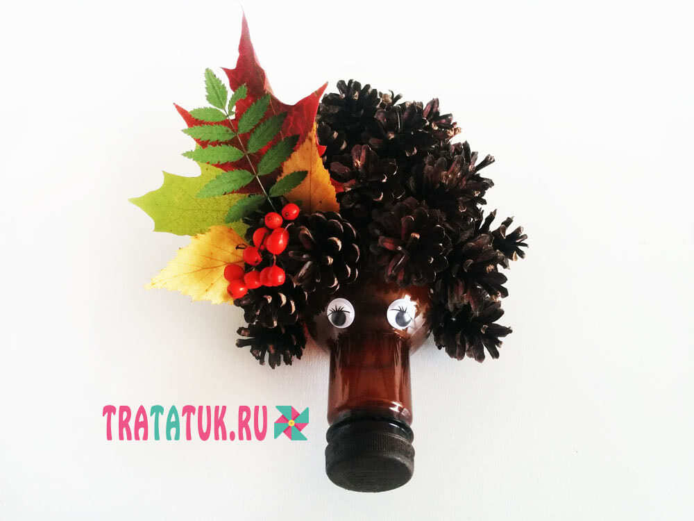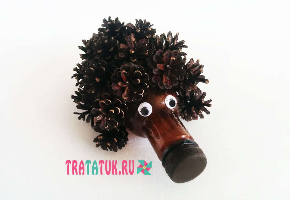 - Еще один вариант ежика из шишек и пластиковой бутылки пошагово в картинках