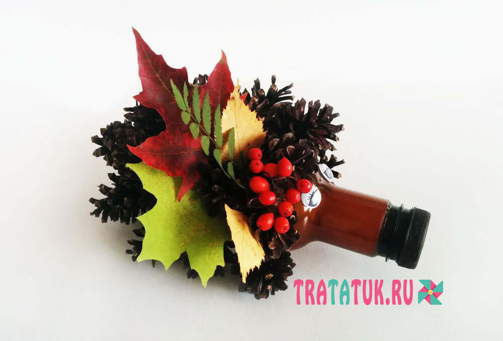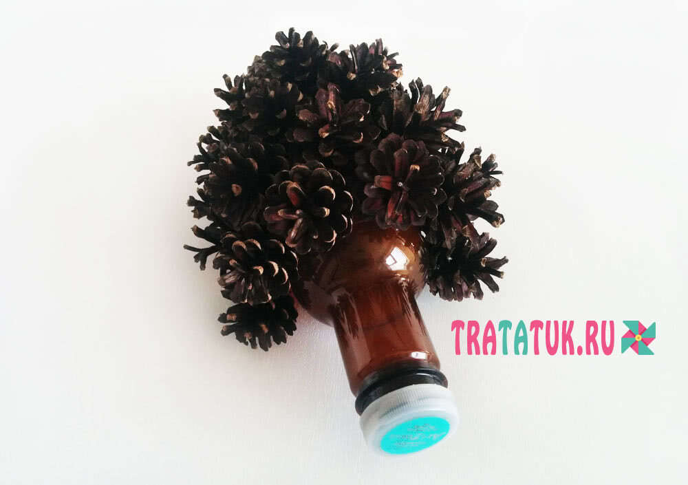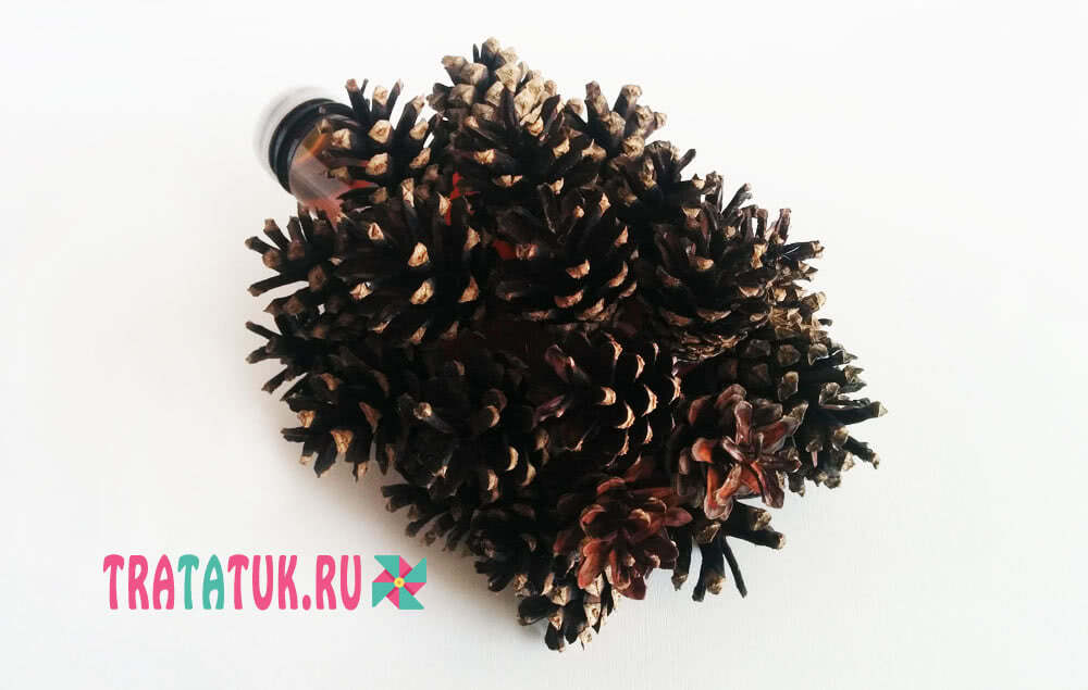 - На туловище ежика из пластиковой бутылки закрепите клеем шишки плотно друг к другу.
