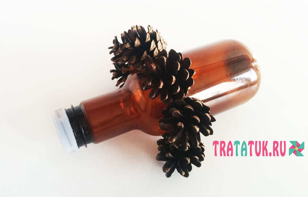 Затем нужно окрасить темной красной пластиковую бутылку, дождаться высыхания и приклеить суперклеем шишки. После этого можно закрепить всю конструкцию лаком для фиксации. Можно также использовать различные блестки и елочные игрушки.