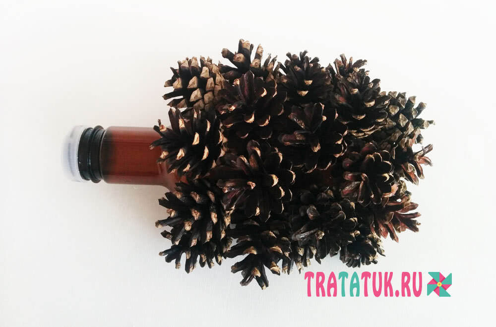 Обклейте шишками всю бутылку. Здесь уже не обязательно клеить ее на бочок, да и не получится, чаще всего шишки в дальнейшем располагаются в прямом положении.