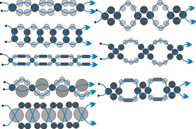 - Плетение выполняется в форме полотна. Рассчитывается желаемая ширина. Нанизывается первый ряд бисеринок. Леска повторно продевается в предпоследнюю бусину, и автоматически последняя перемещается в начало второго ряда.