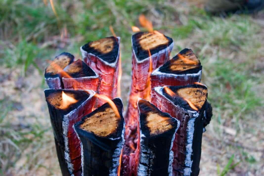 Нужен сухой пень диаметром около 30 см. В качестве древесины подойдет береза, сосна или осина. Если у вас есть бензопила, сделайте 3 вертикальных пропила, чтобы в бревне получилось 6 частей и затем разожгите внутри огонь. В середину пня нужно засунуть бумагу, хворост или мелкие щепки и полить их жидкостью для розжига или бензином.