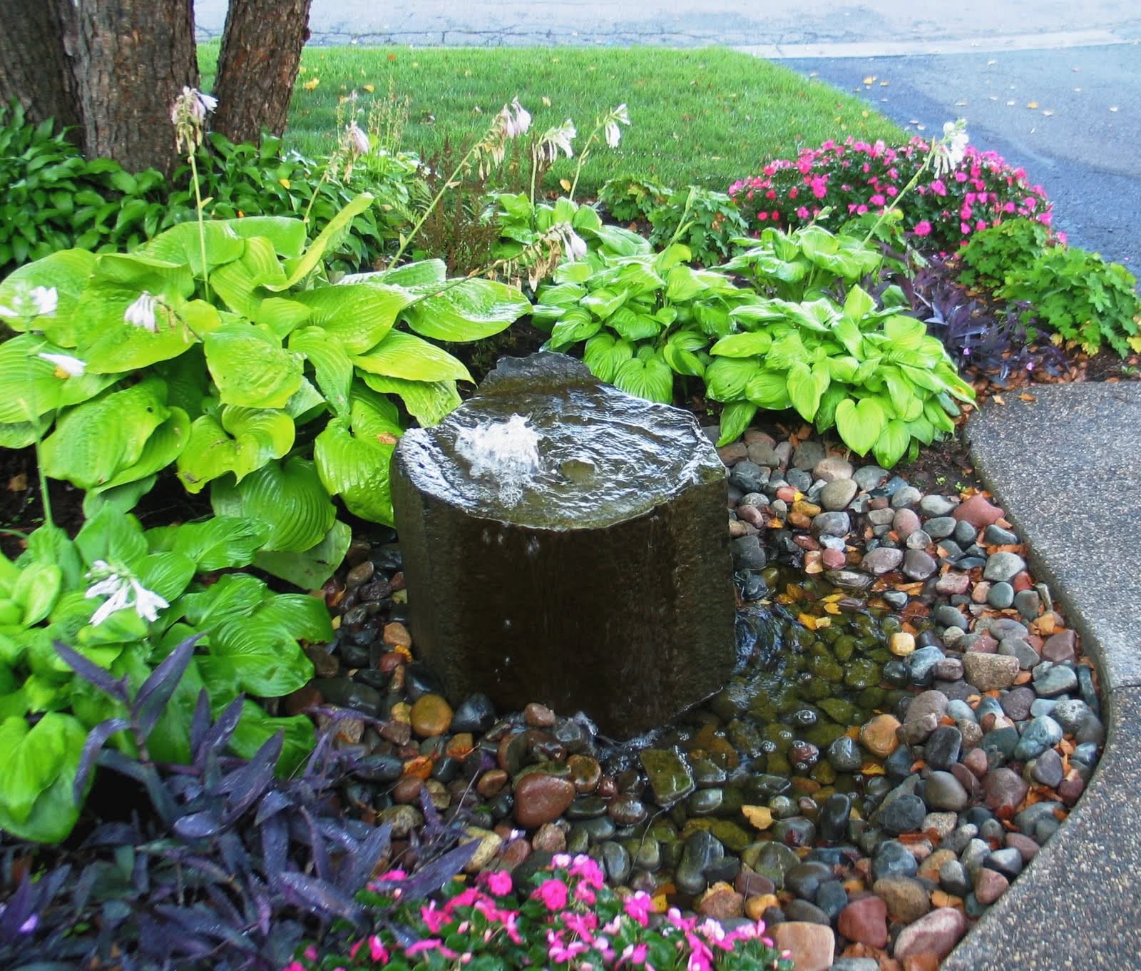 Стильно, современно и креативно смотрятся фонтаны, в которых по главному элементу или целой композиции предметов струится вода. Создается ощущение, что сам камень является источником влаги. Меже тем, вода струится по шлангу, который располагается в центре отверстия валуна (или любого другого декоративного элемента).