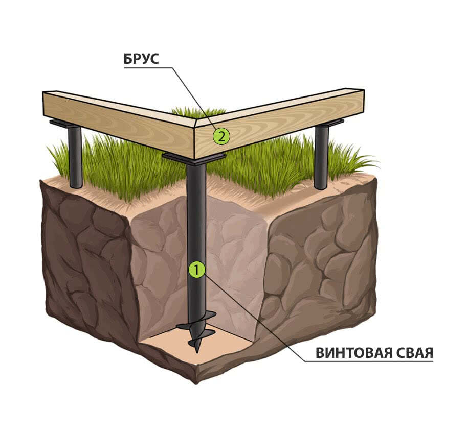 Свайная конструкция устраивается практически также, как столбчатая. Единственным отличием является то, что элементы в этом случае не просто углубляются в землю, а ввинчиваются. Это возможно благодаря тому, что на конце каждой сваи имеется бур.