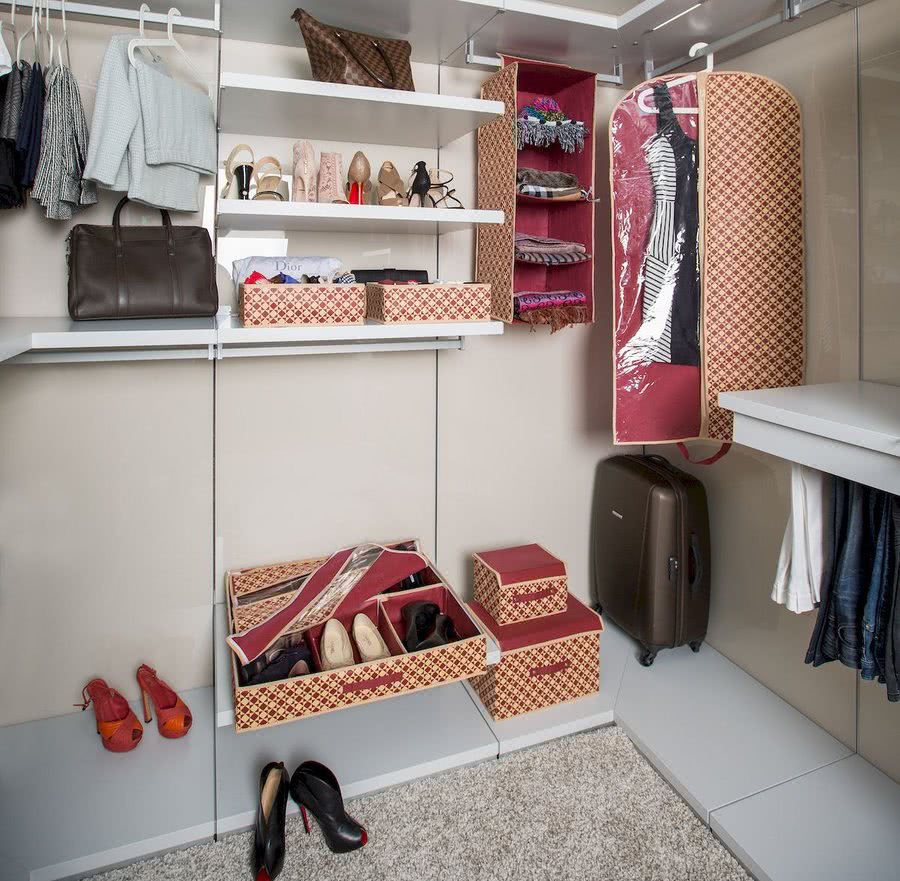 Обычно маленькая гардеробная не может вместить все необходимые предметы, поэтому желательно хранить сезонные вещи на самом видном месте, а другую одежду спрятать в дальние шкафы и ящики. На верхние стеллажи укладываются вещи, используемые крайне редко. На уровне глаз должны располагаться элементы гардероба, применяемые ежедневно или часто.