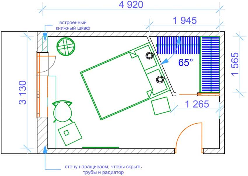 Если площадь получается слишком маленькой, есть возможность немного ее увеличить, сделав стену не ровной, а с выдвинутой немного серединой. Площадь комнаты от этого сильно не уменьшится, а вот вещей может поместиться значительно больше.
