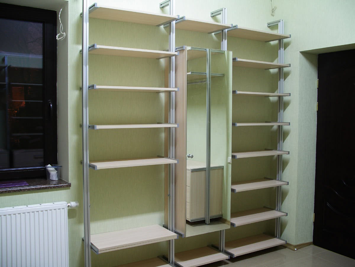 - Мебельная система Джокер для гардеробной. Состоит из множества труб и соединительных элементов, в том числе крепежей для панелей ДСП, зеркал. Преимущества: бесконечное количество вариантов сборки, возможность переставлять местами детали, устойчивость к высоким нагрузкам, подходит для использования на кривых стенах. Недостатки: один вариант расцветки гардеробной.
