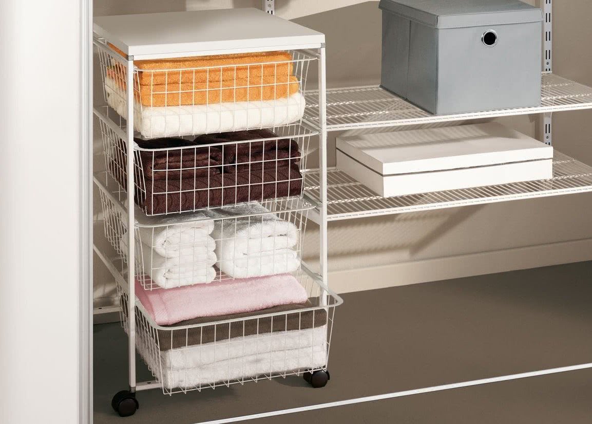 Вещи, которым не требуется глажка, можно хранить в корзинках или коробках. Такие емкости делаются из дерева, пластика или даже ткани. Их можно установить на полках или использовать модели на специальных колесиках.